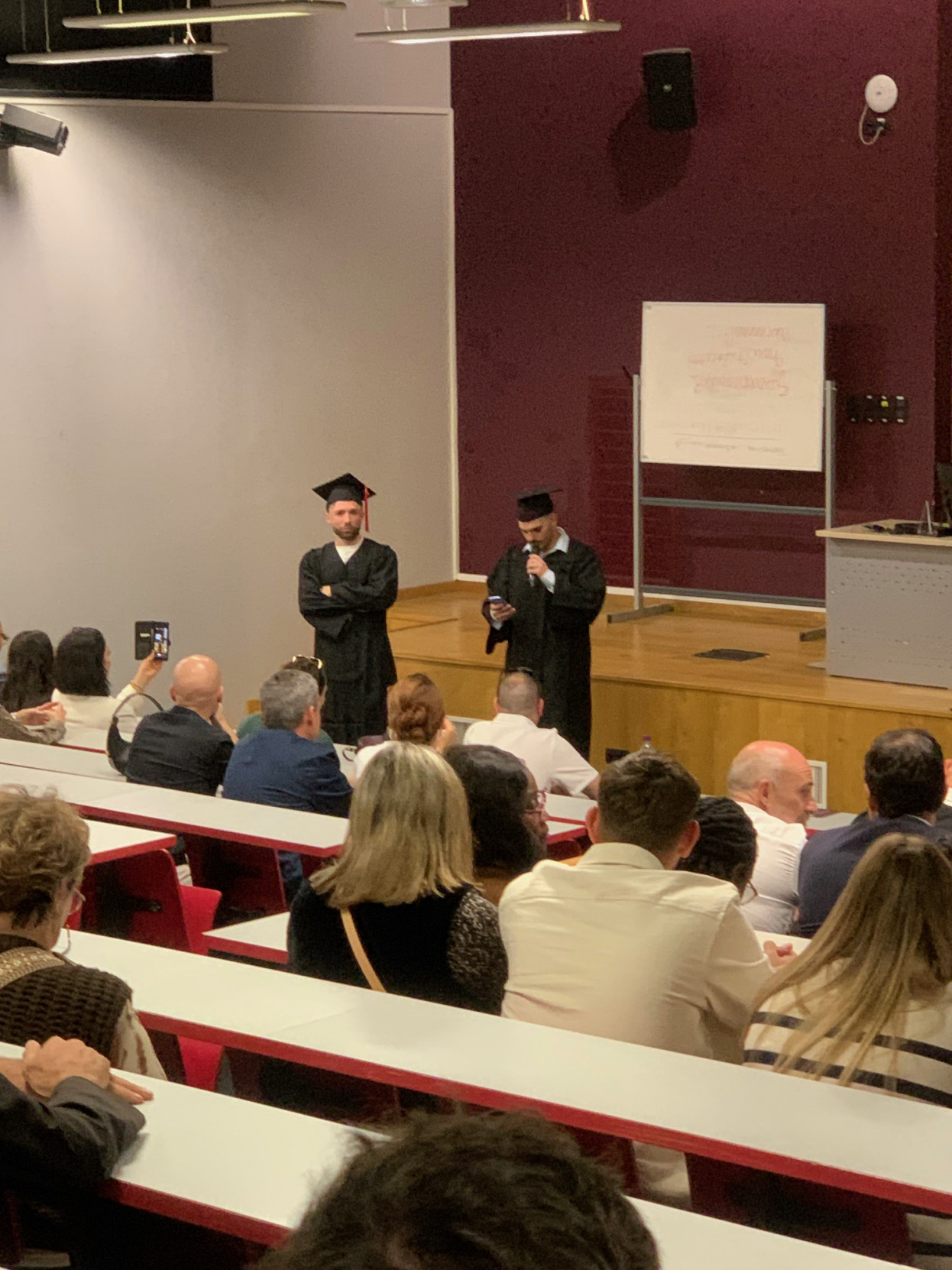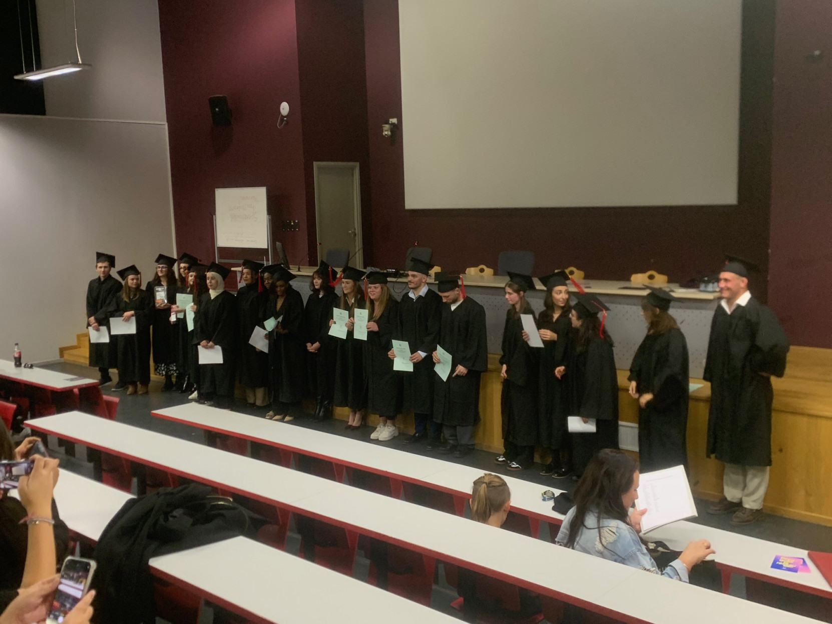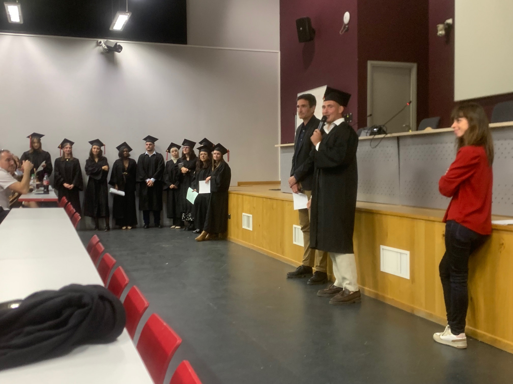 La remise des diplômes de nos masters, promotion 2025 s'est tenue ce vendredi 17/10 dans l’amphithéâtre Michel Cohou en présence des familles, ravies de venir assister à cette étape importante pour nos diplômés.Après une rapide série de discours, chacun a reçu des mains de Mme Gardes et M. Cordelier son attestation de réussite et a pu prononcer quelques mots sur son parcours et remercier les personnes (amis, famille, enseignants) qui y ont contribué.Une belle cérémonie, habilement menée les deux co-animateurs et suivi d'un buffet convivial et des traditionnelles photos en tenue.